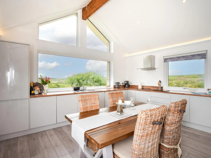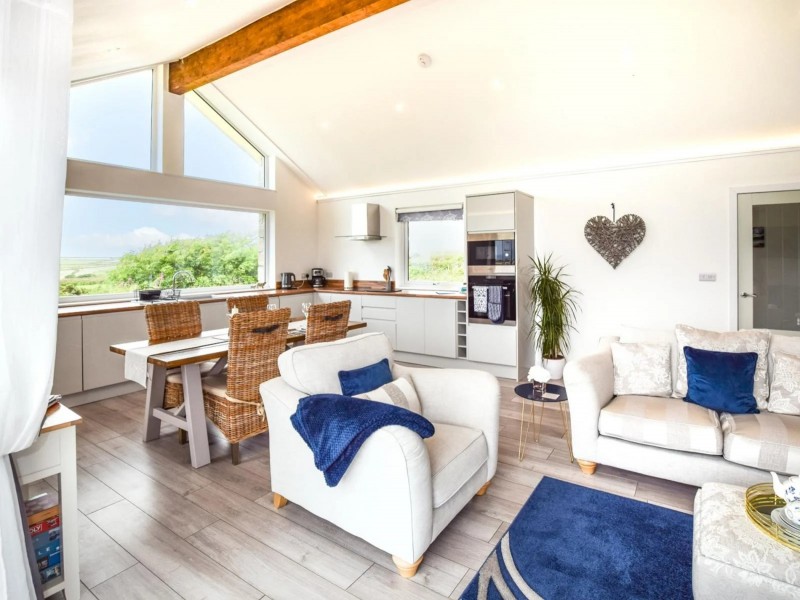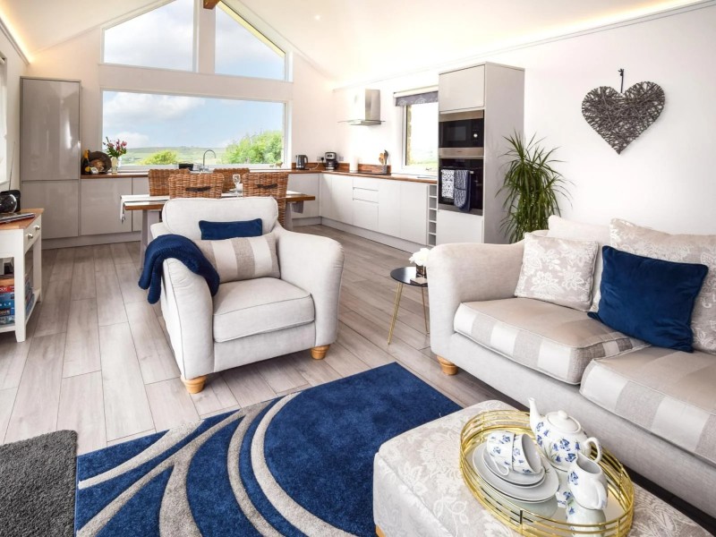 From the moment you arrive, you will not be disappointed. Detached and completely private with a light and welcoming entrance, step inside and hang up your outerwear. Head through into the simply breathtaking open-plan lounge/kitchen/diner with vaulted ceilings and superb panoramic views from every window. The cosy lounge area has a sofa to snuggle up on so you can watch the smart TV after a day exploring the area. The dining area has seating for two so you can plan your day ahead over morning coffee. Equipped with everything you’ll need, the kitchen has an electric oven and hob, fridge/freezer, dishwasher, washing machine and microwave – perfect to create a romantic meal one evening. Head through to the generous super-king-size zip-and-link bedroom (which can be made up as a twin on request) complete with smart TV, wardrobe and en-suite bathroom with freestanding bath with rainfall shower, attachment and WC.
