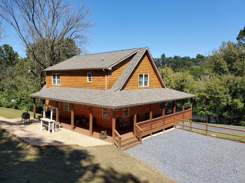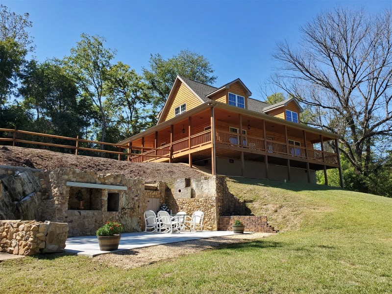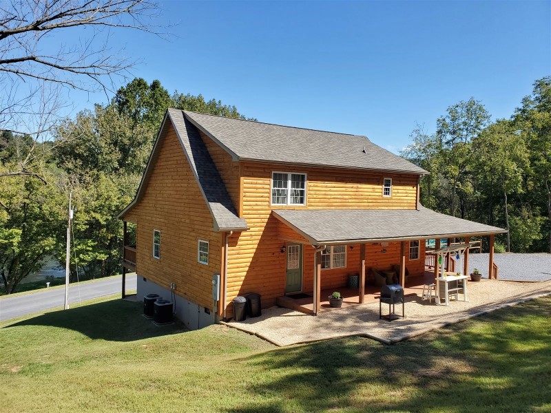 Welcome to River Rock Cabin. This is a stunning NEW cabin located on the tranquil Shenandoah River. You can have a perfect romantic getaway or a fun filled family vacation. This luxury cabin is filled with amenities. The 2,200 square foot cabin has 3 bedrooms and 2 bathrooms. The fully equipped kitchen makes it easy to share a meal while making memories in the open-concept kitchen, dining and great room. The great room has cathedral ceilings, multiple chandeliers, and a custom wood beam. The staircase has custom iron work. The living room and bedrooms offer satellite television. Enjoy coffee in the mornings on the wrap- around porch and watch captivating sunsets in the evening. Don’t forget about having a drink and snack at the tiki bar.