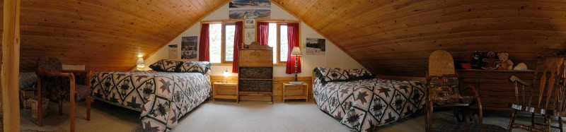 The loft contains a queen bed and a single bed. It overlooks the main floor's living room and dining area from its 200 square foot "open" floor plan.