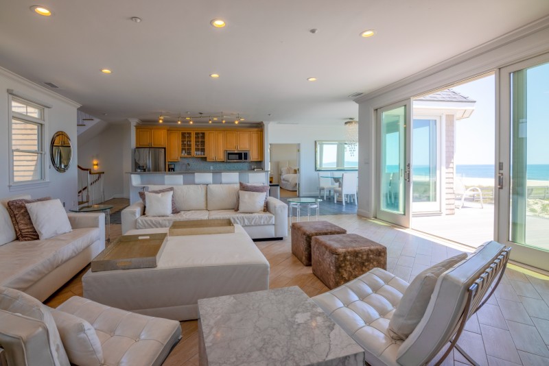 2nd floor Living area has sweeping elevated views of the ocean and the bay. Majestic huge living space windows & sliding deck doors make you feel you are floating over the ocean. Find inspiration with spectacular sunrises from your private deck. Fabulous ocean views and sea breeze while you dine serenely at either the dinner table or center island / bar stools.