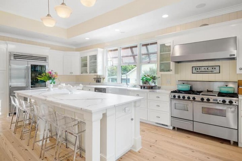 Kitchen's make the house. This one is amazing. Large and well equipped with a bead board vaulted ceiling. 10 ft. marble topped center island with room for six bar stools and an appliance package with wine cooler, subzero glass refrigerator, 5 Star double oven 6 burner range. The kitchen also boasts a farmhouse table with seating for 8. A bonus is the keeping room open to the kitchen with 4 upholstered club chairs and great views of the pool area. Speaking of pools this one's deep. 9.5ft in the deep end. Lots of comfortable padded chaise lounges to catch those summer rays. An elevated sun deck sits under the palm trees and give shade to those that relax and catch a nap with the cool ocean breeze. The beach access is directly across the street and right out the back gate. Couldn't be any easier to get the family to the ocean.