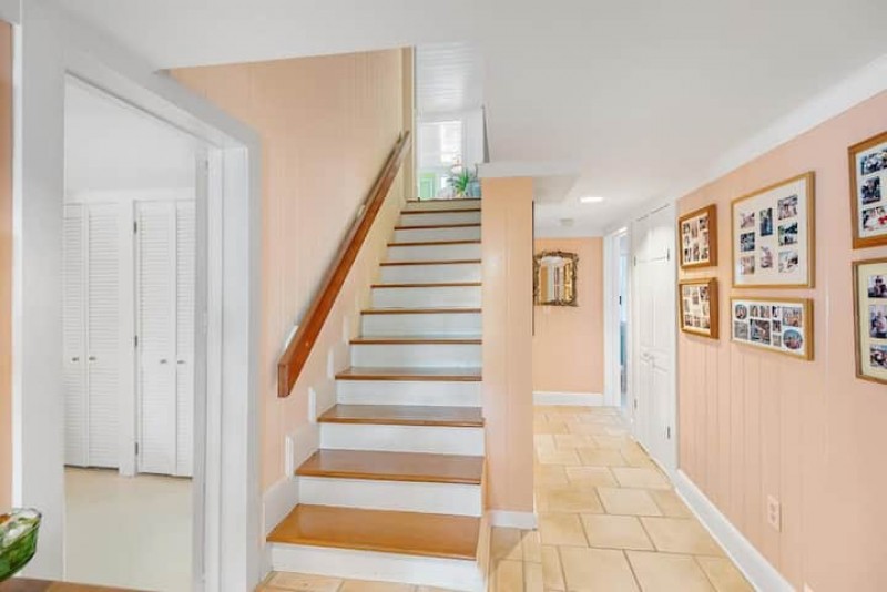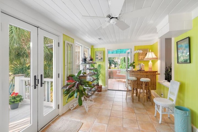 The foyer reveals the character of the home with bead board ceilings and walls. A large dining area with room for 12. The first of two living areas is adjacent to the dining room and has a comfortable sofa and several rattan pillowed chairs. You will love the sun porch with views to the pool and warm tiles, bead board ceilings and comfortable wicker club chairs. The screen porch has ocean views and will probably be your favorite spot in the house with pastel ceilings, porch swing, wicker chaise lounge and views of the pool.