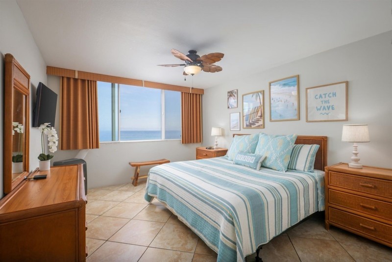 The fully equipped kitchen boasts modern appliances, including a stove, oven, microwave, dishwasher, and coffee maker, allowing you to prepare delicious meals with ease. Enjoy your culinary creations at the dining table or take them outside to the private balcony, where you can savor your meal while soaking in the ocean breeze.