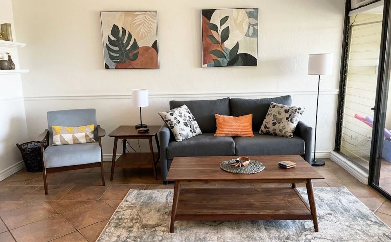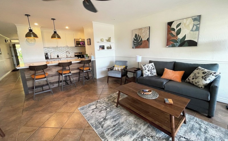 The condo boasts a well-equipped kitchen, complete with modern appliances such as a refrigerator, microwave, oven, and dishwasher, along with essential cooking basics and spices. Enjoy your meals at the dining area or take them outside to savor the fresh Hawaiian air.