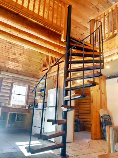 When you enter the log cabin, you will find a comfortable open space with a kitchen and dining corner on the left, and living room area on the right. In the back, a large modern bathroom on the right, and a multi-use room with a pull-out sofa on the left. The spiral staircase in the middle of the cabin leads you to the lofts, where you will find 2 separate sleeping areas connected by a catwalk. Each of these sleeping areas has a queen bed and two twins making a total of 8 sleeping spaces upstairs.