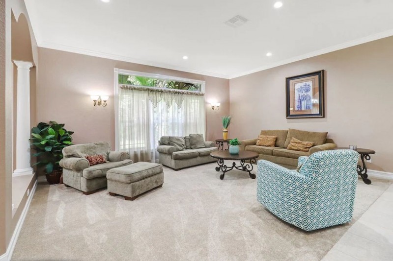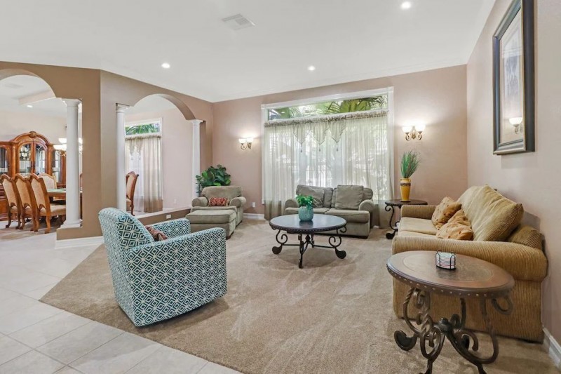This beautiful home features a large kitchen with skylight and full LED lighting, 2 living rooms of which one has a large screen TV while the family room features a sleeper sofa and enough seating for family game night. Don't forget about the additional Game Room with 7' Billiard Table, large screen TV and a small Bar for entertaining guests and family while having direct access to the Pool and Spa.