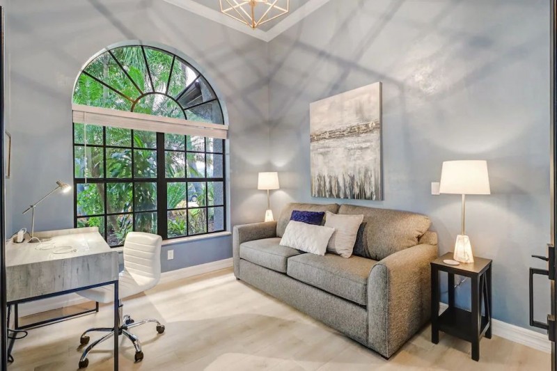 The Living area features a large TV with Comcast Cable and smart TV functionality. A Denon receiver for music is also supplied that will play music throughout the home or patio. The living room oversees the Patio seating and Pool area, and the slider doors can be fully opened for access to the Patio.