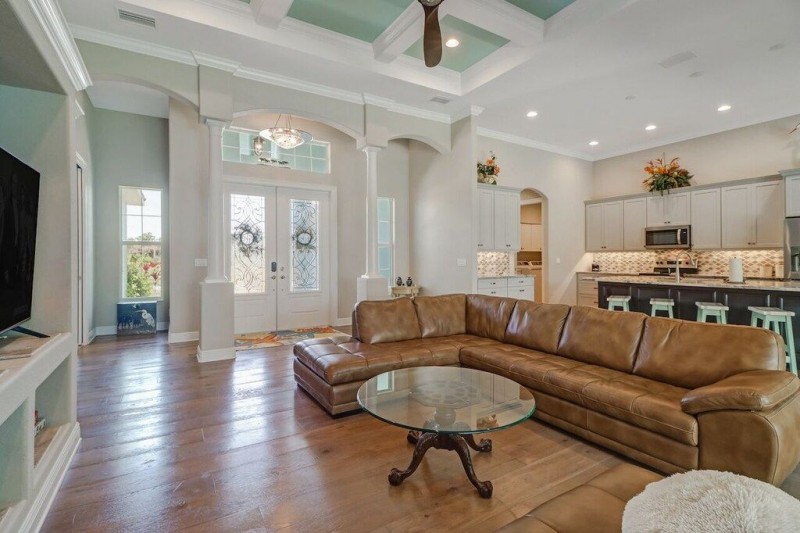 The home features an open floor plan with 2200 sq ft under air, a 3 car garage and boat dock including lift for our guests to use. The first step into the home reveals the open design as you enter the living room that oversees the Pool and patio area. The large center island eat in kitchen with lots of cabinet space and fully upgraded countertops in granite is open to the living room.