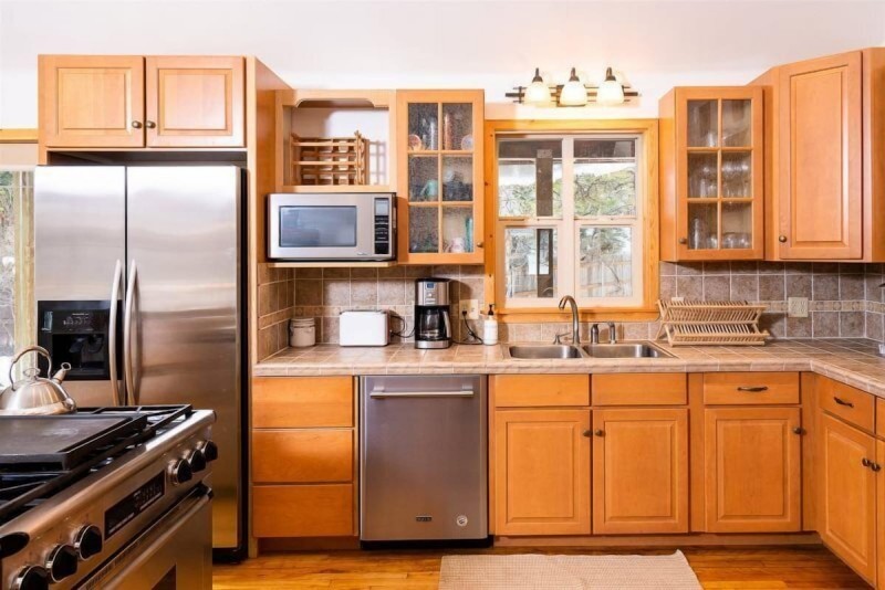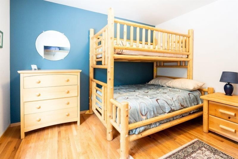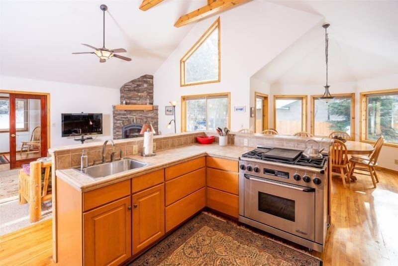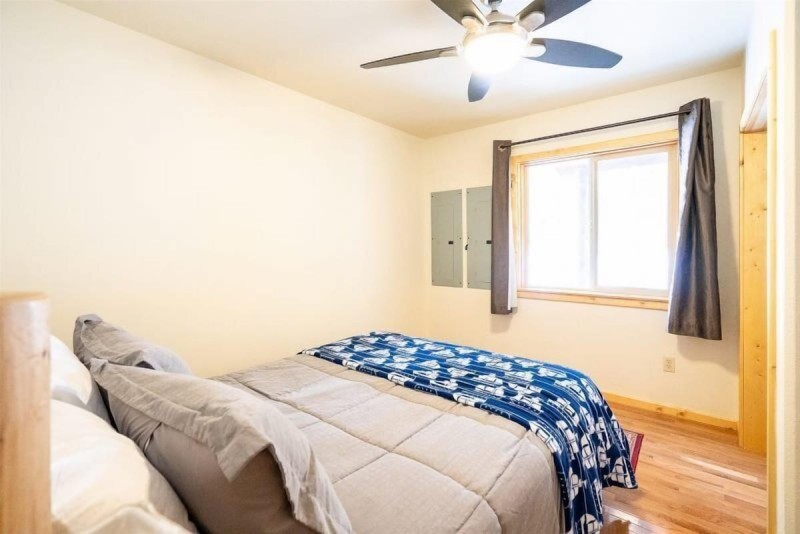 The main floor of The Smitty Place includes kitchen with high end kitchen appliances including a wine fridge, 30-inch Kitchenaid Dual Fuel Stove, and two sinks for easy prep. There is also bar seating for four, dining nook with seating for six, the living room with Smart TV and propane fireplace, one queen bedroom, one bunk room with a twin over full bunk bed, and a full sized bathroom with double vanities. Also accessed on the main floor is the laundry room, located in the garage.