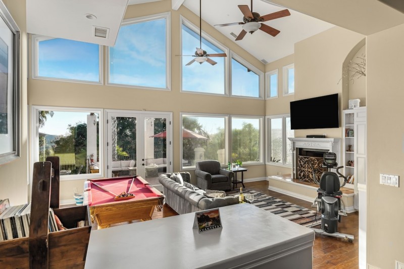 Step inside this seven-bedroom, five-bathroom estate where classic interiors meet modern entertainment. The sunlit main living room features soaring windows and plenty of space to gather. A pool table and foosball add to the fun, while the chef’s kitchen with stainless steel appliances and large island makes entertaining easy. Outdoors, enjoy a sparkling pool, multiple al fresco dining spaces, and upper balconies perfect for morning coffee or evening sunsets.