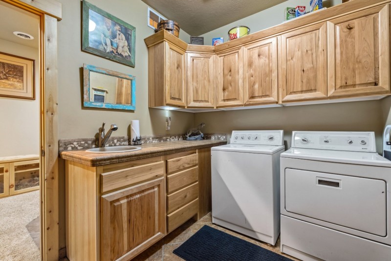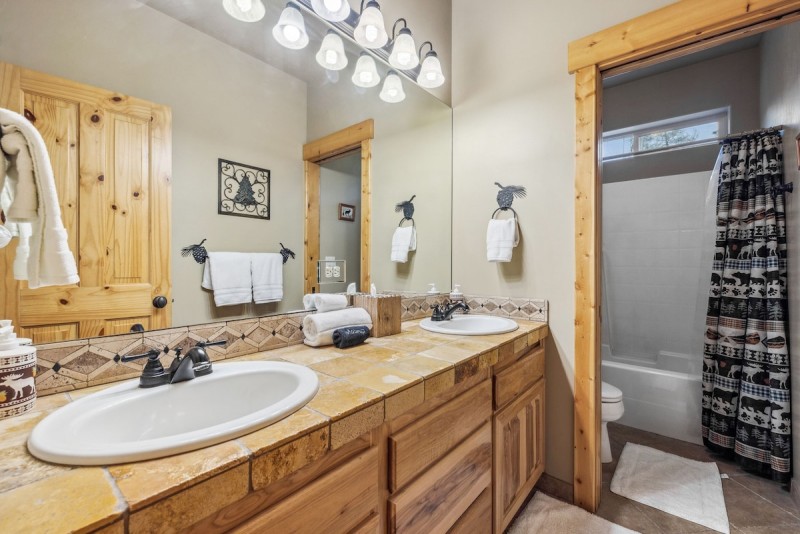 Inside, you will discover two living areas, offering ample space for relaxation and entertainment. The upstairs living area is tailored to both children and adults, with an array of games to enjoy. Whether it's a board game night with the family or a competitive round of cards with friends, this property provides opportunities for fun-filled moments. With the cabin-in-the-mountains ambiance, most of the furniture in this vacation rental boasts a log-style design, creating a cozy and authentic atmosphere. With warm lighting and natural elements, the home is comforting and welcoming.
