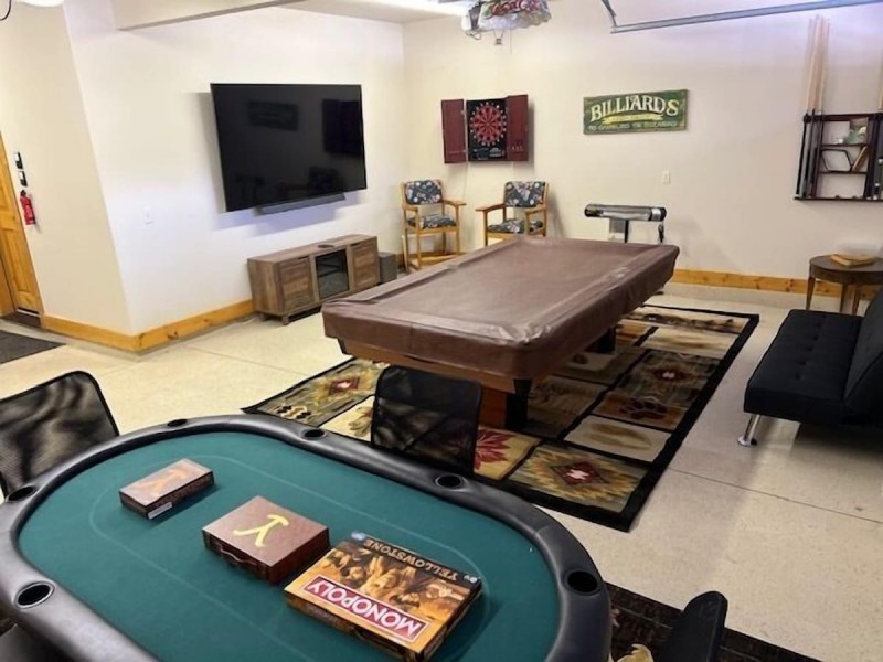 For those seeking a bit of friendly competition, head to the game room located in the garage where you will find a foosball table, pool table, card table, and electric dartboard, guaranteeing hours of entertainment for guests of all ages. Parking is no concern, as there is ample space for vehicles and trailers in the driveway (no parking in the garage), ensuring convenient access to all the recreational activities the area has to offer.