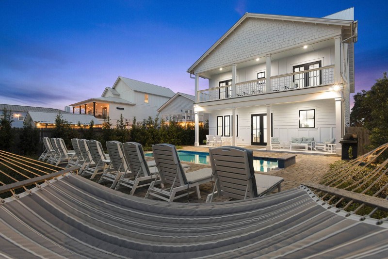 This fantastic beach oasis features 7 King Suites with private bathrooms and an amazing custom bunk room with two queen bunk beds, it sleeps several large families comfortably. It also features 3 large indoor living rooms, two substantial balconies, a game room, a relaxing front porch swing, spacious pool deck with hammock for everyone to find their own space to enjoy. Each floor includes it's own “Morning kitchen” with coffee makers, ice-makers and mini-fridges. To top it off – there's 8 parking spots!
