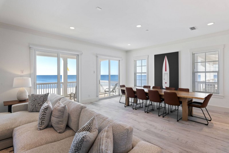 This luxurious beach vacation home is rich with modern architecture in its design and flow. The incredible balcony and patio situated directly Gulf of Mexico invites memories to be made and stories to tell your friends and family for generations to come! Experience a plethora of comfortable seating outside where you can relax while feeling the calming salt air of the gulf breezes that surround you.