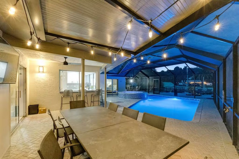 The living level and Pool/Spa lanai is on the same level with no stairs which makes this large home much more attractive then the three and four story homes with the pool a flight of stairs down, plus much safer being able to see the children and be part of the action since the large opening kitchen/bar window is right there giving you and your guests a great gathering area to communicate and have fun!