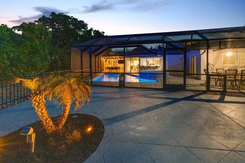 Bay And Then The Gulf of Mexico , Pool, Hot Tub And BBQ Area Within A Screen Enclosure. There Is A Nice Sized Sunning Patio As Well With Views Down The Waterway. This Home Entertains Excellent Because The Pool Area Is On The Same Level As The Main Living Area. There Is A Large Pass Through Window That Opens To A 6 Person Bar On The Covered Lanai, This Is Great Because The Kids Can Come Straight From The Pool And Eat Lunch Wet In Their Swimming Suites. There Are Three Separated Bedroom Areas Which Is Great For Families Traveling Together Giving Them A Little Privacy. There Are 3 Bathrooms And A Half Bathroom, One Of Which Doubles As A Bathroom Directly Off The Pool Area. There Are Also Three Living Areas With Large Screen TV's, Many Inside And Outside Dinning Tables, Sun Lounges, Beach Chairs, Beach Wagon, And Some Toys.