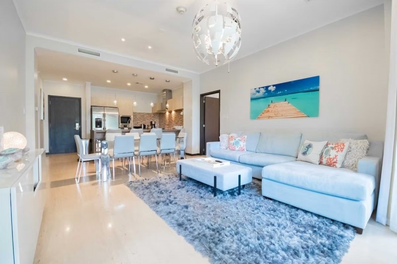 The open plan living area is provided with a large TV, a light blue 4-seat sofa-bed with chaise (with a queen-size mattress), a 6-seat glass dining table, and a full-sized fully equipped modern kitchen with 4-barstools. There is also a half bathroom and a laundry room with a washer and dryer available for your comfort.