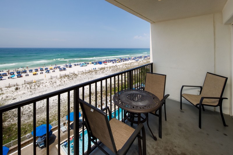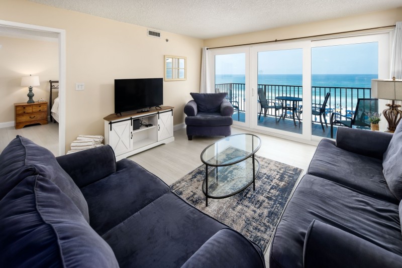 This gulf front, 2 bedroom/2 bathroom condo includes: A fully stocked kitchen for preparing meals, a separate dining area, and a breakfast bar. A living room with a queen size sleeper sofa for extra guests, a flat screen TV, and a private balcony with direct gulf views. A master bedroom with a king size bed, flat screen TV, and private bathroom. A second bedroom with a bunk bed that includes a full size bed on the bottom bunk and a twin size bed on the top bunk. A second full size bathroom in the hallway. Washer and dryer in unit.