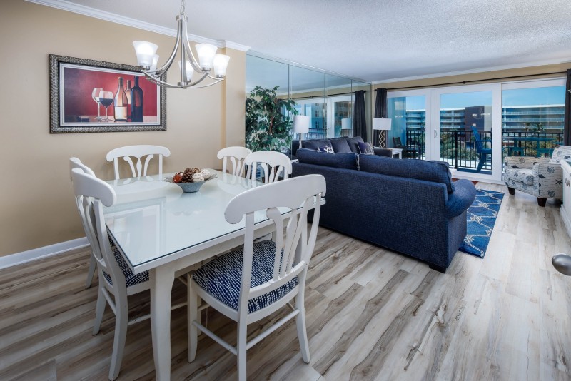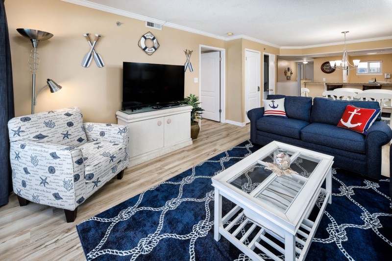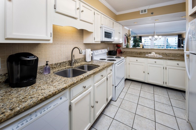 This 2 bedroom/2 bathroom condo includes: A fully stocked kitchen for preparing meals, a seperate dining area, and a breakfast bar. A living area with a queen size sleeper sofa for extra guests, flat screen TV, and a private balcony with partial gulf views. A master bedroom with a king size bed, a flat screen TV, and a private bathroom. A second bedroom with a queen size bed and a flat screen TV. A second full size bathroom in the hallway. Washer and Dryer in unit.