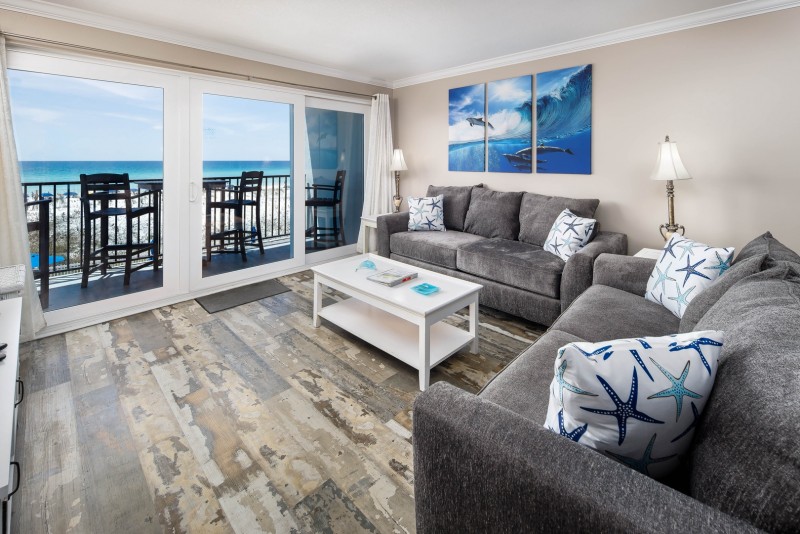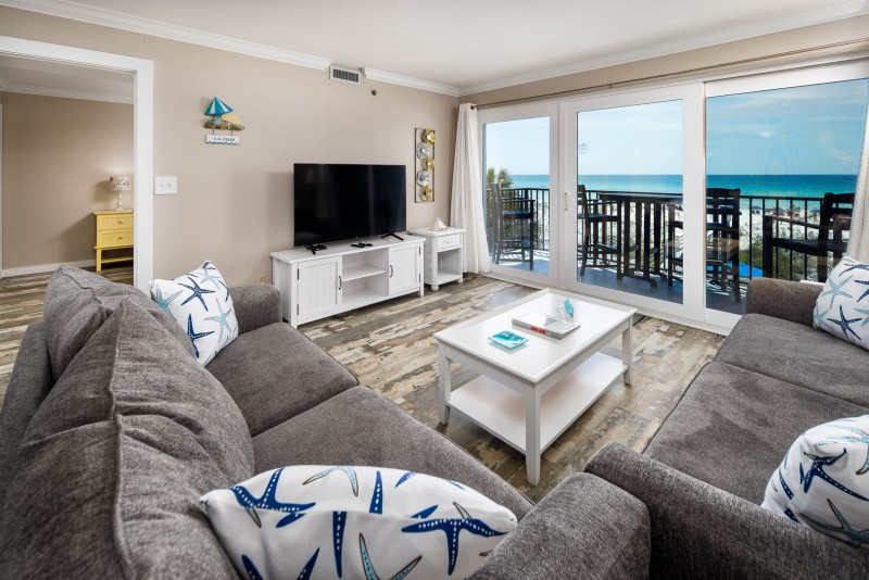 This beautifully upgraded, 2 bedroom/2 bathroom condo includes: A fully stocked kitchen for preparing meals, a seperate dining area, and a breakfast bar. A living room with a queen size sleeper sofa for extra guests, a large flat screen TV, floor-to-ceiling glass sliders with direct gulf views, and a private balcony. A master bedroom with a king size bed, a flat screen TV, and a private bathroom. A second bedroom with two twin size beds and a flat screen TV. A second full size bathroom in the hallway. A laundry room with a full size washer and dryer.