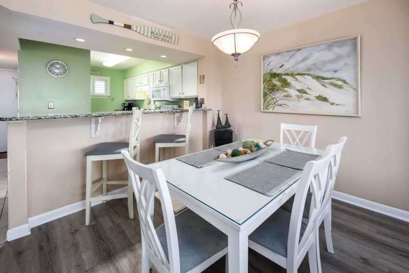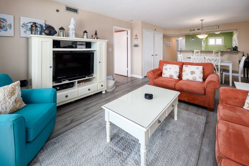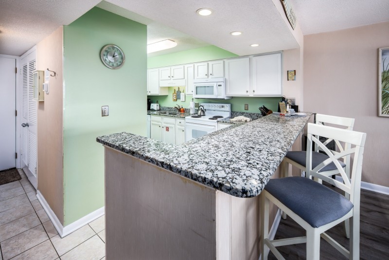 This 2 bedroom/2 bathroom condo includes: A fully stocked kitchen for preparing meals, a separate dining area, and a breakfast bar. A living room with a queen size sleeper sofa for extra guests, a flat screen TV, and a private balcony with partial gulf views. A master bedroom with a king size bed, flat screen TV, and private bathroom. A second bedroom with two twin beds and flat screen TV. A second full size bathroom in the hallway. Washer and dryer in unit.