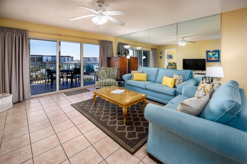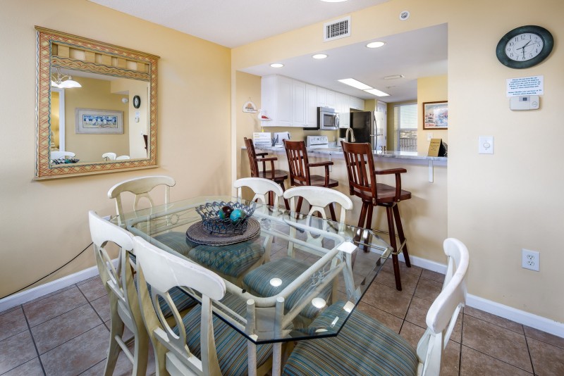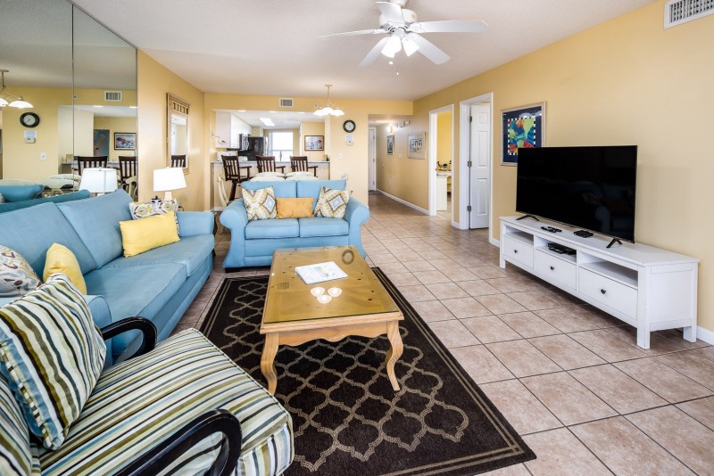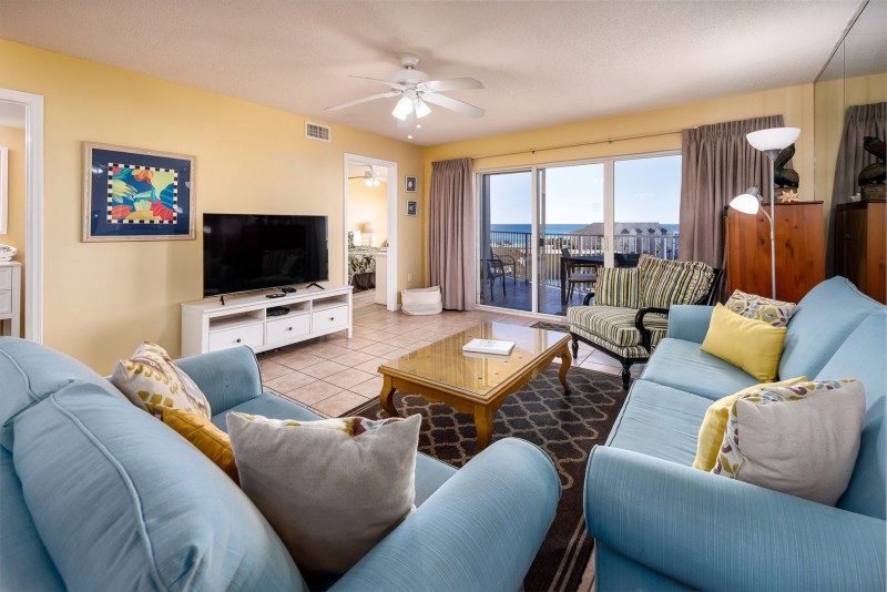 Fifth Floor, two bedroom, two bath condo with an open floor plan sleeps 6 . Fully stocked kitchen with everything you need to cook a meal in. Dining area with seating for 6 and three bar stools at the kitchen bar. Living area hosts a queen size sleeper sofa for extra guests. Large Smart TV with DVD player, Bluetooth speaker and charging station with two USB ports and two USB cables provided for other brands. Large spacious balcony with a spectacular view of the Gulf of Mexico.