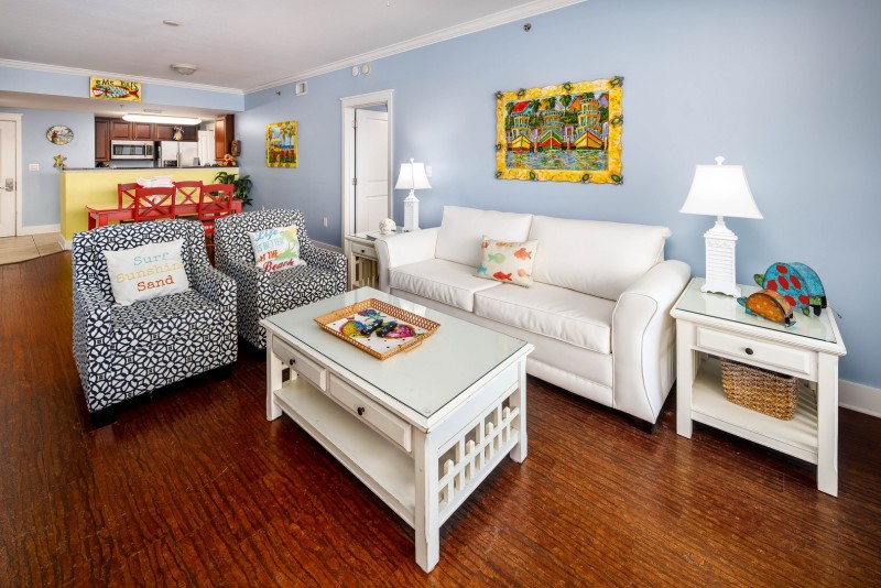 Living area hosts a queen size sleeper sofa with Flat screen tv/dvd player/stereo and large sliding glass doors to the oversized balcony with a wide open view of the gulf. Located on the quiet side of the building. Additional half bath off the living area.