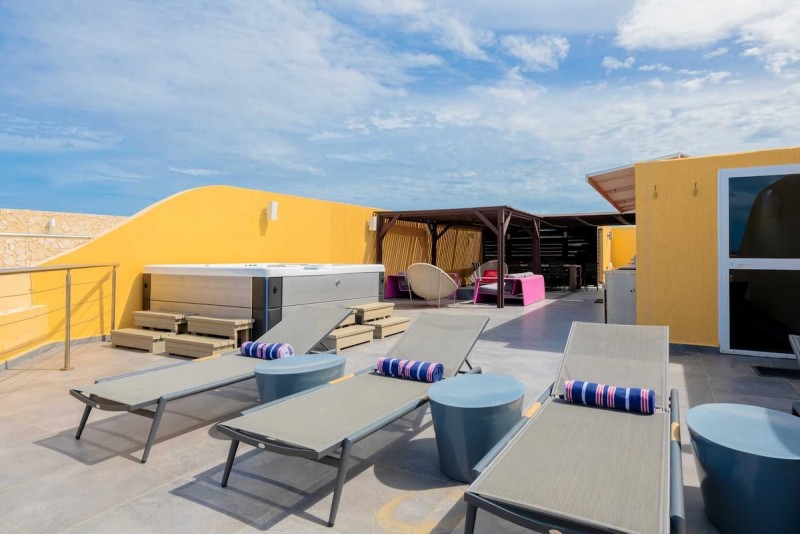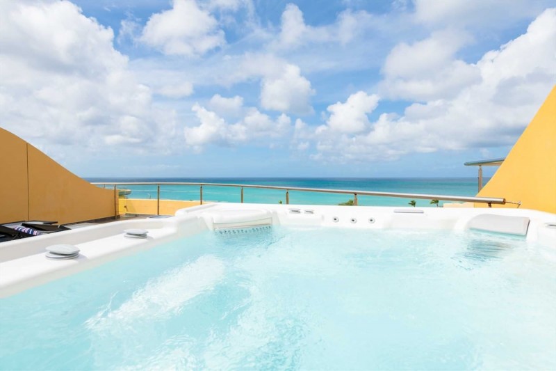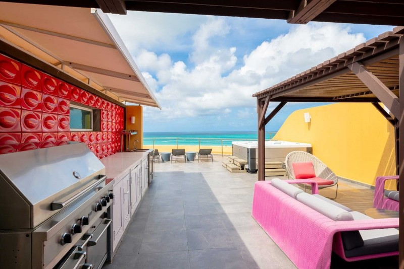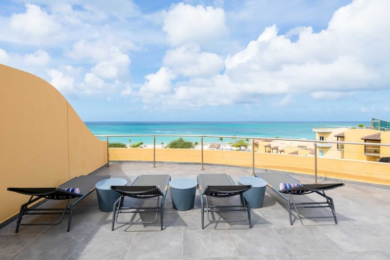 Oceania Deluxe Beachfront Condo Resort - Panoramic View 4BR Penthouse with large private rooftop terrace plus large Hot Tub, outdoor kitchen with BBQ-grill, 4 bathrooms, picturesque views of the Eagle Beach from all 3 levels, sleeps 8.