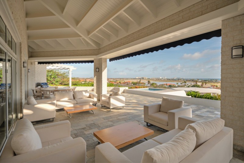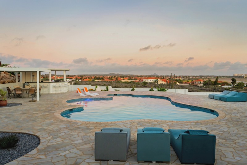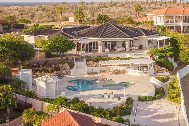 The impressive Majestic Retreat Five-bedroom mansion represents the ultimate luxury vacation rental in Aruba, perfect for all ages. Boasting over 4500 square feet of indoor and outdoor living, there is more than enough space for entertaining, sunbathing, and relaxation. Spread over two levels, the outdoor haven is highlighted by the stunning views of the island and the Caribbean ocean. It is completed with a large hot tub, a fire pit plus seating area, a large swimming pool, a private beach tennis court, an open-air bar area with a large BBQ-grill, and several lounge and dining areas.