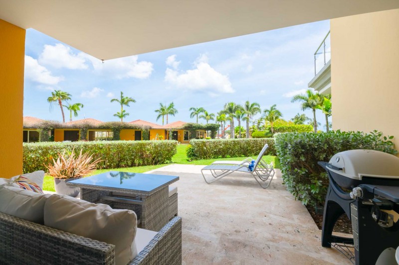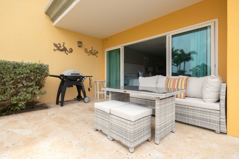 Oceania Deluxe Beachfront Condo Resort - Garden Delight Studio condo with a bathroom, a kitchenette, furnished terrace with a BBQ-grill, easy access to the resort's pools and just steps from Eagle Beach, sleeps 4.