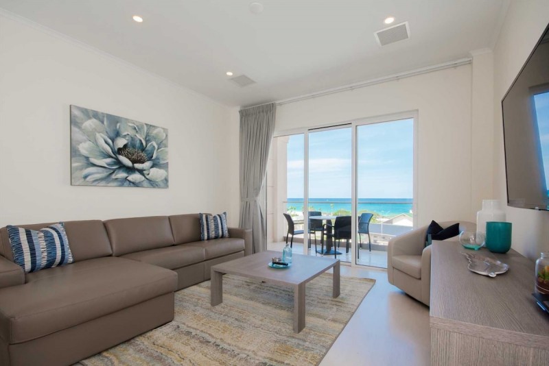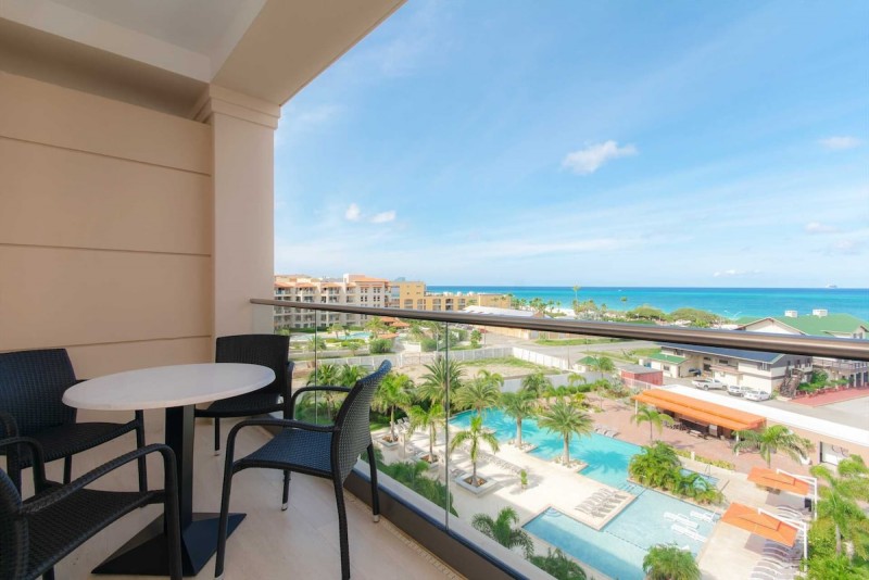 Sun-splashed days and amusing nights are yours to savor at the Coastal View Two-bedroom condo. Watch the cruise ships reach the island in the morning or watch the boats, jet skis and catamarans cruise by during the day, and at sundown, enjoy the magical sunsets that Aruba has to offer, all this from your balcony. The balcony stretches across the living room and primary bedroom and is completed with a 4-seat dining table. The Coastal View Two-bedroom condo is a modern vacation rental condo located at the LeVent Beach Resort Aruba, the newest vacation rental resort on the 'One Happy Island' of Aruba.