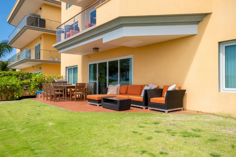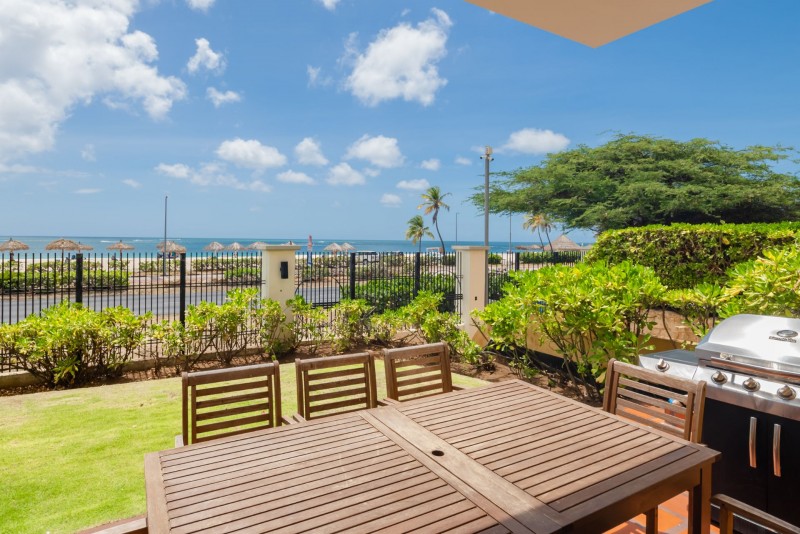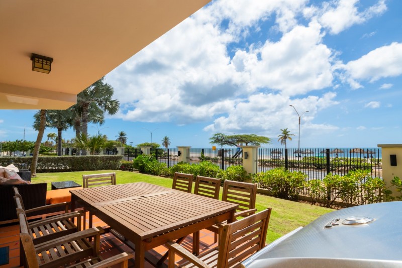 The most exciting area of this unit is the private patio off of the living room, overlooking the world-famous Eagle Beach! Outdoor lounge chairs and patio furniture including a 6-seat outdoor dining table and full-size BBQ grill. One of the resort's three large swimming pools is actually less than 10 yards from this unit's garden! Free broadband wired and wireless internet, three cable TVs, (in the living room and each bedroom) are available for your extra comfort. This unit provides you with 2,500 sq. ft. of living space, plus an additional 1,200 sq. ft. of private patio and garden space. This unit is located in the Eagle (=beach-side) building on the ground floor, right on the Eagle Beach.-Sleeps max 4.