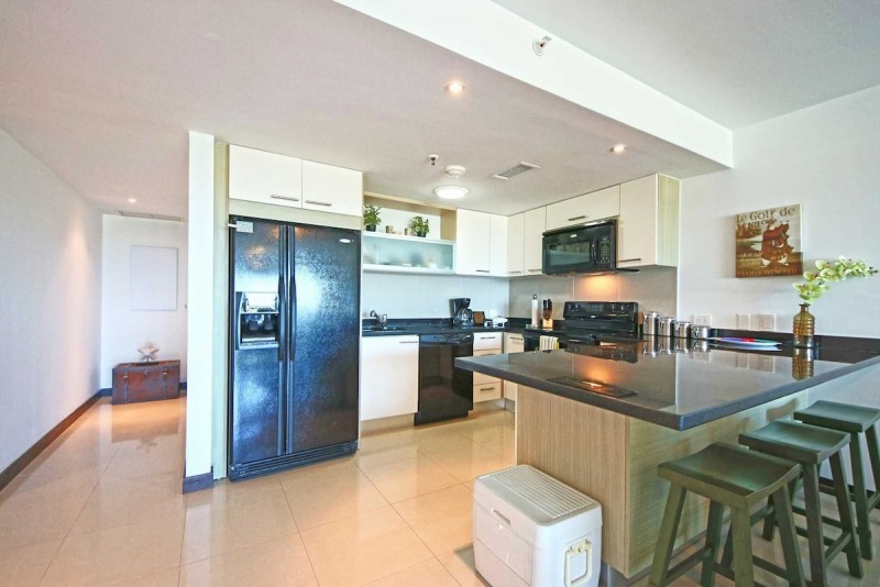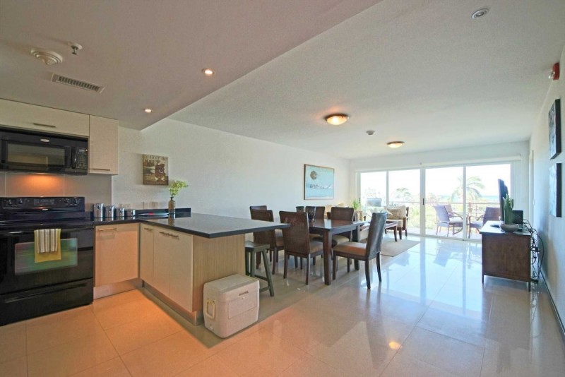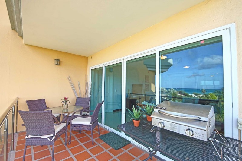 The living area has a balcony with a 4-seat dining table and BBQ-grill plus amazing resort pool and ocean views. The living room has a sofa-bed plus two armchairs, a TV, a full-sized fully equipped kitchen with 3-bar stools plus separately a 6-seat dining table. The hallway that lends access to the bedrooms, has access to the third bathroom with a shower and the laundry closet with a stacked washer/dryer combo plus the storage facility and beach chairs.
