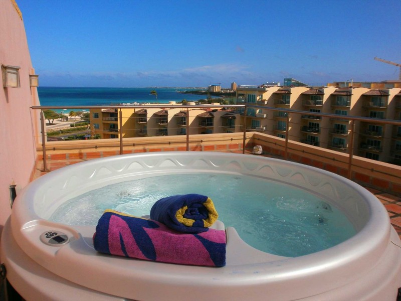 The Tropical Penthouse One-bedroom condo is the only 1-bedroom PENTHOUSE (TOP-FLOOR) of the entire resort; all other penthouses have two bedrooms or more. The tropical-themed living room has a queen-size sofa-bed, a full-sized fully equipped kitchen with a 4-seat cocktail table. The living room also proves access to the balcony with a panoramic ocean view and BBQ-grill. Furthermore, accessed through an internal spiral staircase, there is a private tiled roof terrace stretching over the entire condo, with terrace furniture, a 4-person outdoor hot tub, and a majestic ocean view! The bedroom has a king-size bed and a built-in closet. The bathroom with a shower is located in the hallway. There is also an in-room washer/dryer facility.