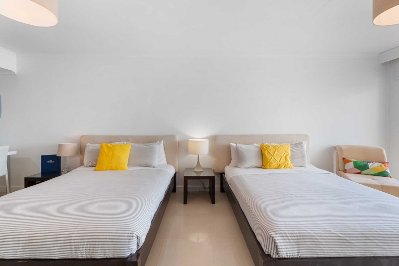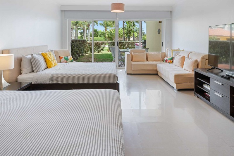 NOTE: This studio room can be combined with the next-door Beach Garden One-bedroom condo (E124-2) through an internal connecting door to become the original Beach Garden Two-bedroom condo (E124), accommodating up to 8 guests.