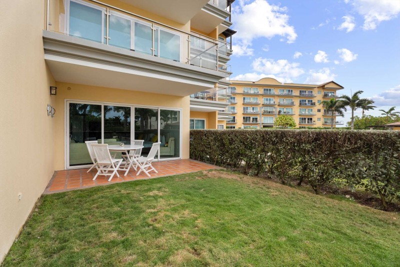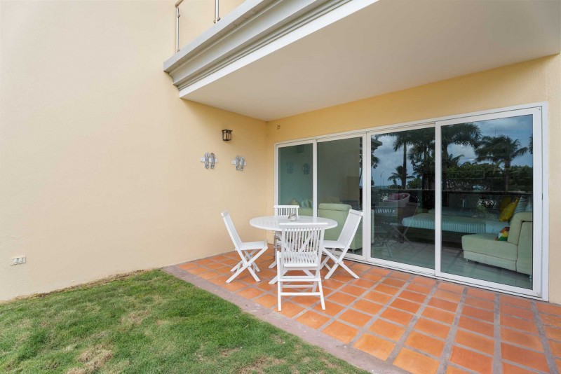 The ground floor beach rental, Beach Garden Studio condo, sleeps 4 guests in two queen-size beds.There is a private terrace with patio furniture and garden area which is just a few feet away from one of the resort's swimming pools, and has ocean view through the property's lush landscaping. The studio room features a kitchenette with a full-sized fridge and freezer, a 2-burner electric stove, oven, microwave, small appliances, kitchenware, and tableware. It includes a 4-seat dining table, a TV, and a walk-in closet leading to a bathroom with a shower. This unit is one of the few studio condos at this resort that offers a semi-private washer/dryer facility (=shared with next door's Beach Garden One-bedroom condo, locked on both sides)!