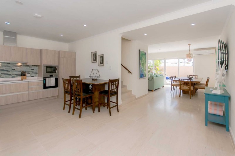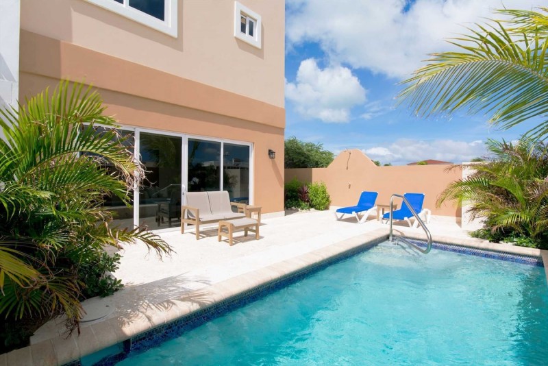 The Blue Ocean View Two-bedroom townhome is situated just a few steps from the white-sandy shore and tranquil turquoise waters of the world-renowned Eagle Beach of Aruba. Plan your sunny getaway to this tastefully furnished beach house, completed with Tommy Bahama furniture to enhance your vacation experience. This spacious and modern 3-level luxury vacation rental offers you a back patio with a private plunge pool (up to 5ft deep), an outdoor shower, outdoor seating, and chaise lounges to enjoy the Aruban weather. Additionally, you have a large private rooftop terrace with a partial ocean view, its own BBQ grill with an outdoor dining table plus chaise lounges.