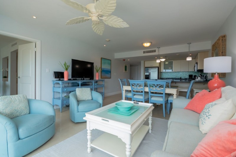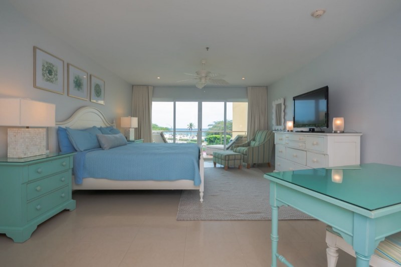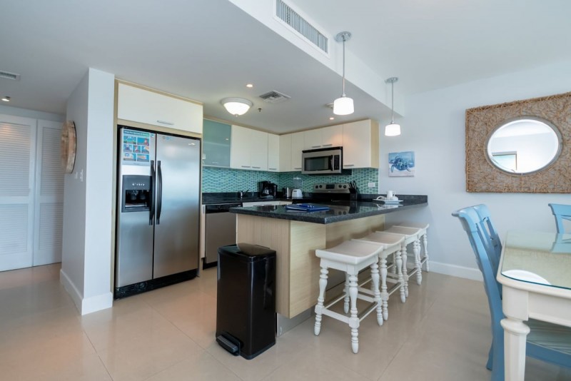 The great living room is decorated in bright aquamarine colors and is adjacent to the living room balcony with a 4-seat dining table, full-size gas BBQ-grill plus amazing ocean view. The living room is also completed with a 6-seat wooden dining table, a full-sized fully equipped kitchen with 4-bar stools to easily cater to all your family meals. Behind the kitchen area, there is a laundry(washer/dryer) /storage/facility hallway. There are thus three balconies with amazing views, adjacent to the living room, the primary bedroom plus the second bedroom.