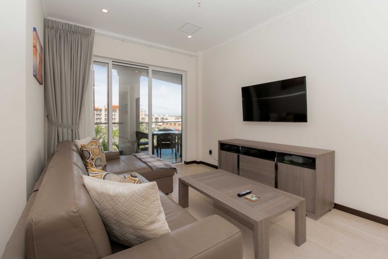 The open plan living area is provided with a large TV, a leather sofa-bed (with a double-size mattress), a 6-seat round dining table, and a full-sized fully equipped modern kitchen with 4-barstools. There is a laundry room just off the kitchen with washer-dryer and storage facilities. The half bathroom is also located in the living area.