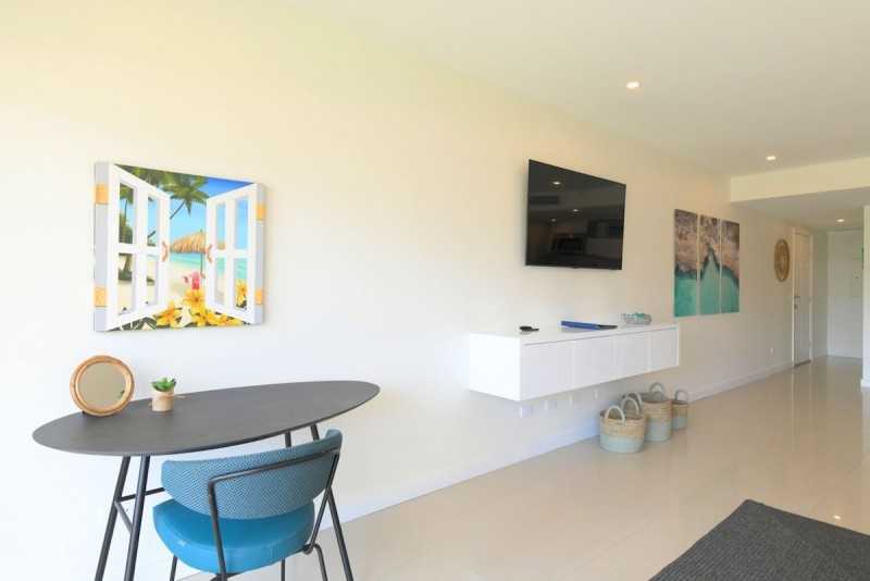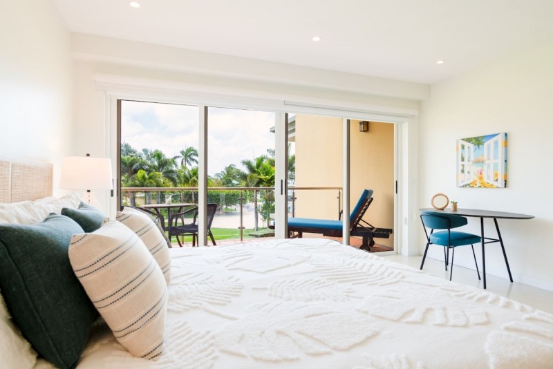 This uniquely decorated and spacious Superior View Studio condo sleeps 3 guests in a king-size bed and a single sofa-bed. There is a balcony with ocean views through the lush tropical landscaping of the resort. The studio room features a kitchenette with a full-sized fridge and freezer, a 2-burner electric stove, oven, microwave, small appliances, kitchenware, and tableware. It includes a 4-seat oval dining table, a TV, and a walk-in closet leading to a bathroom with a shower.