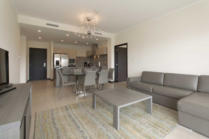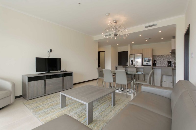 The living area is provided with a large TV, a 3-seat sofa-bed (with a double-size mattress), a 6-seat glass dining table, and a full-sized fully equipped modern kitchen with 4-barstools. There is also a half bathroom and a laundry room with a washer and dryer available for your comfort in the hallway.
