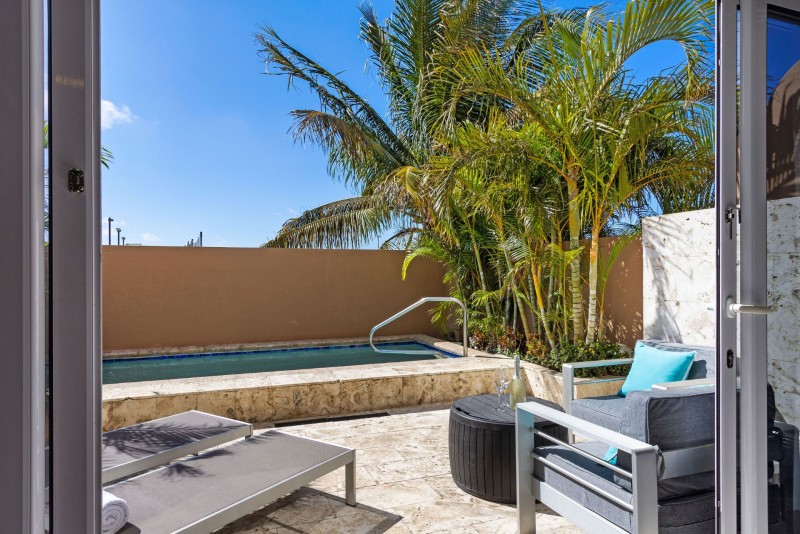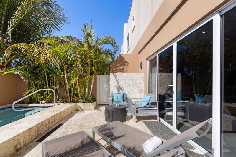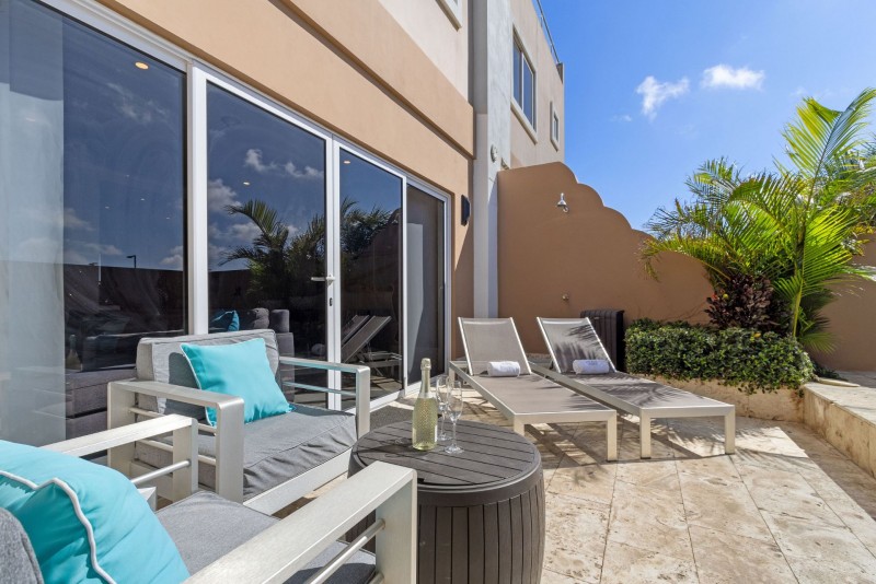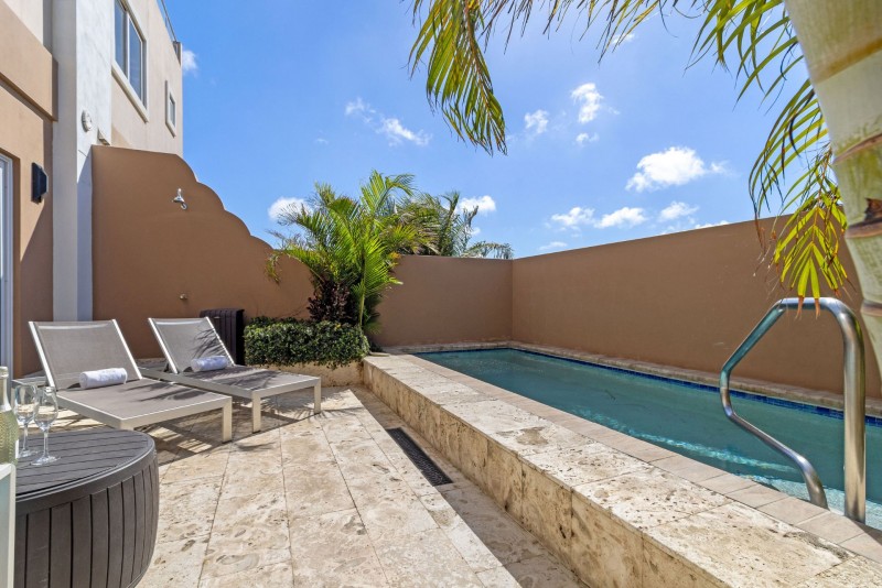 Nestled merely footsteps from the globally acclaimed Eagle Beach of Aruba - a proud recipient of the #1 beach title in the Caribbean and the third best globally - this three-tiered townhome boasts an array of luxurious amenities. You are welcomed by a private back patio, featuring a plunge pool of up to 5 feet in depth, an alfresco shower, comfortable outdoor seating, and two chaise lounges to indulge in the Aruban ambiance. Additionally, the expansive private rooftop terrace presents a partial vista of the ocean, a dedicated outdoor kitchen complemented by a BBQ-grill, an outdoor dining arrangement, a lounge area, and another pair of chaise lounges.