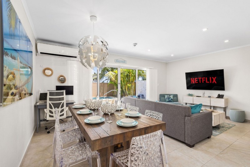 Experience a refined Aruba getaway, surrounded by the sun, pristine white sands, and the captivating turquoise waters at the "Happy Island" Two-bedroom townhome. This exceptional beachfront rental property, encapsulated by its name, elegantly blends hand-selected island-themed decor with a contemporary interior. Whether you're planning an unforgettable family reunion or a cherished retreat with friends, this property is poised to deliver unparalleled memories.
