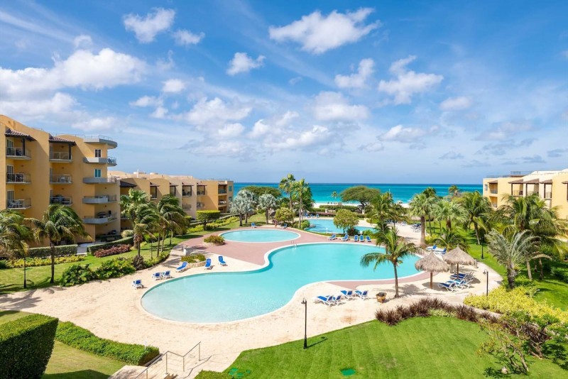 Oceania Deluxe Beachfront Condo Resort has 3 large swimming pools and a kid's shallow pool surrounded by sunny and shaded lounges areas. The 2 beach access gates are only 25 yards from Eagle Beach. Resort amenities include 2 fitness rooms, a sauna, a business center, and a kid's playroom. Enjoy free parking within the secure 24/7 gated complex. Sports enthusiasts have access to tennis, racquetball, squashball, pickleball, and padel courts at no cost (bring your own equipment). Immerse yourself in the tranquility of the resort, a stroll on the beautiful beach, or a swim in the tranquil Caribbean sea.