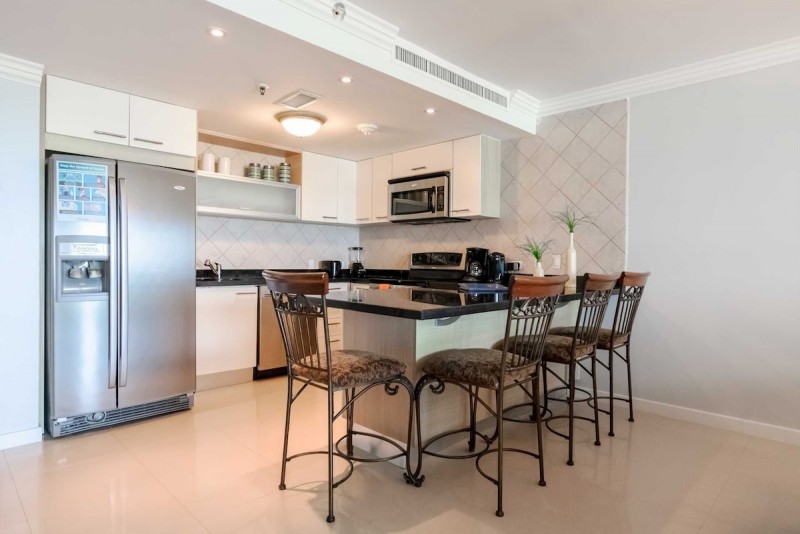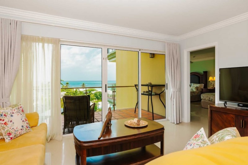 The Glamour View Two-bedroom condo is located just a few steps away from the popular, Eagle Beach. With great ocean views from floor-to-ceiling glass sliding doors on each balcony, you can take in stunning sunset views from inside the condo or on the two balconies.