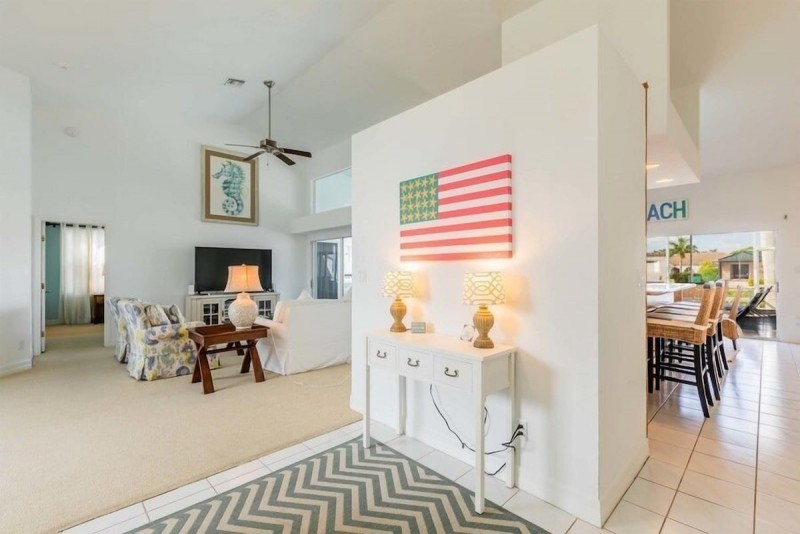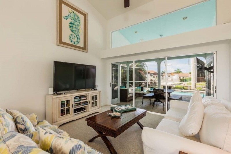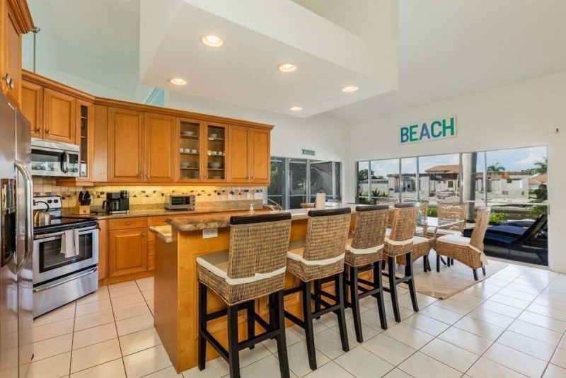 Gorgeous Home with SW Exposure, Open Floor Plan with Vaulted Ceilings seamless Indoor/Outdoor Living. The best part of the home is not only the open floor plan but the outdoor kitchen and large flat-screen TV. Guests can BBQ and watch the big game without having to go inside. Kitchen is open to the family room with a breakfast bar and stools as well as another dining area. The pool area is perfect to soak up the Florida sun.