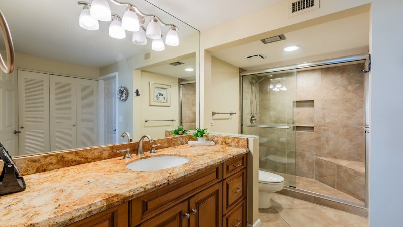 The guest bathroom has a granite top vanity and a tub and shower combo. The balcony has ample seating to have dinner or drinks to watch a perfect Marco Island sunset.