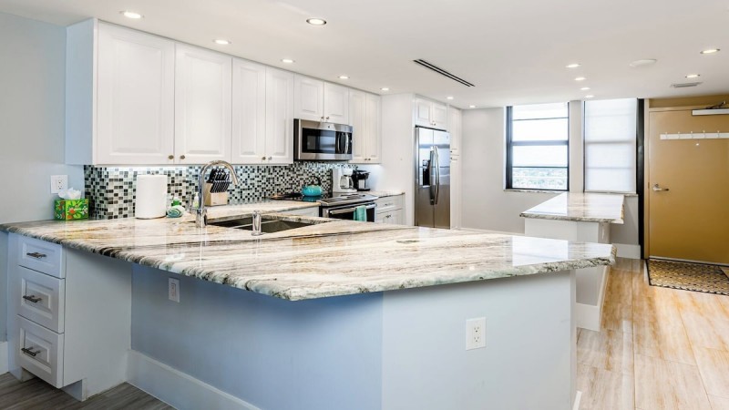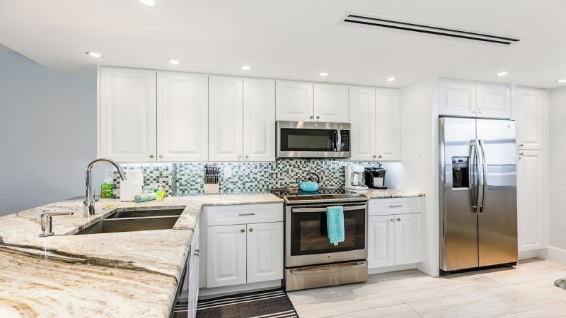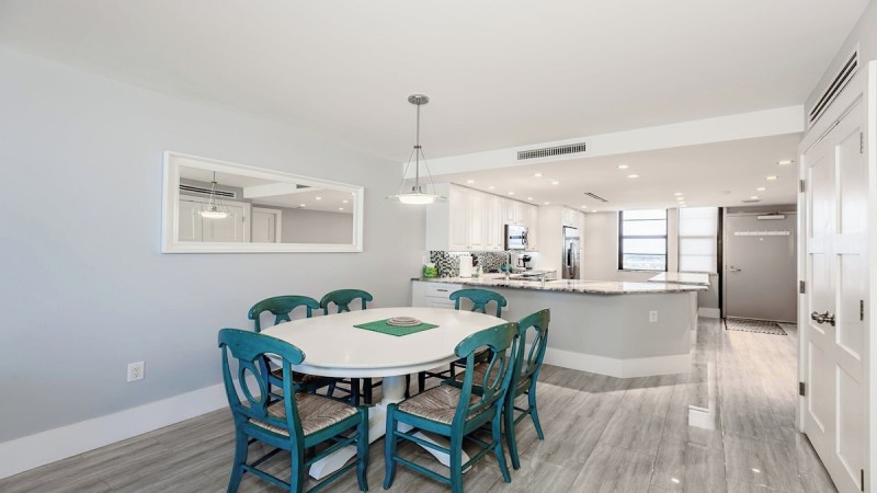 This newly renovated two-bedroom, two-bath beachfront condo has a beautiful kitchen with new cabinetry and granite countertops overlooking the dining area and living room. The living room has a contemporary flair, with a large sofa and armchair and a wall-mounted flat-screen TV. The main bedroom has a king bed, tile floors, and a wall-mounted flat-screen TV. The en-suite bathroom has a dual sink vanity and a walk-in shower.