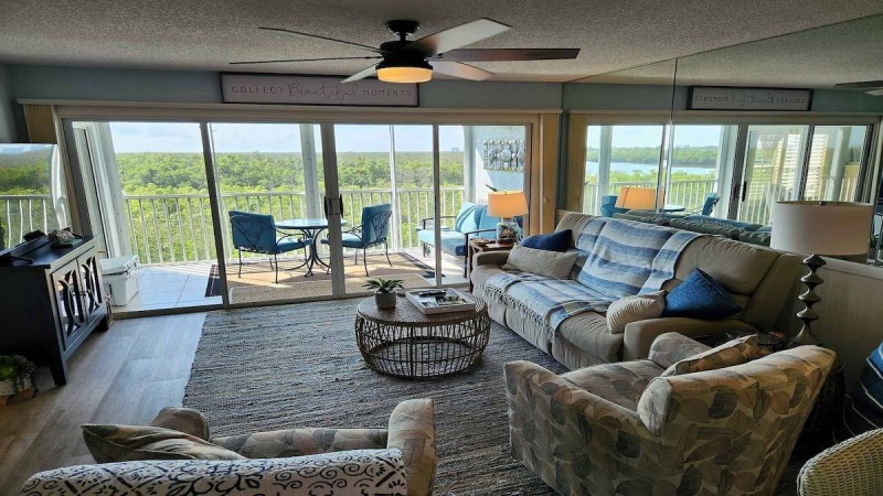 God’s creation from your screened in patio where birds fly by regularly in the mangroves and sunsets are beautiful. There’s even a window in the master shower facing the