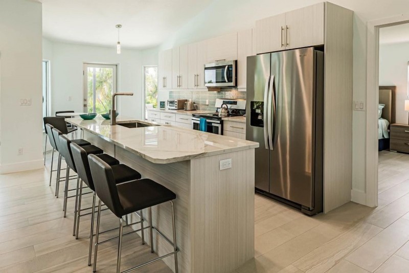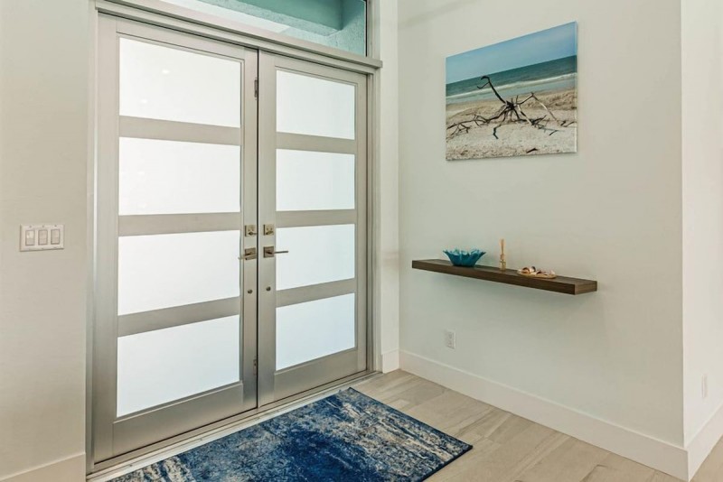 The ample high-ceiling, open floor plan with the grand room, brings in plenty of natural sunlight making the living/dining room a light and bright space finely decorated coastal contemporary-style. Original photographical artworks combined with natural elements and pastel color palette, bring the beach into the house.